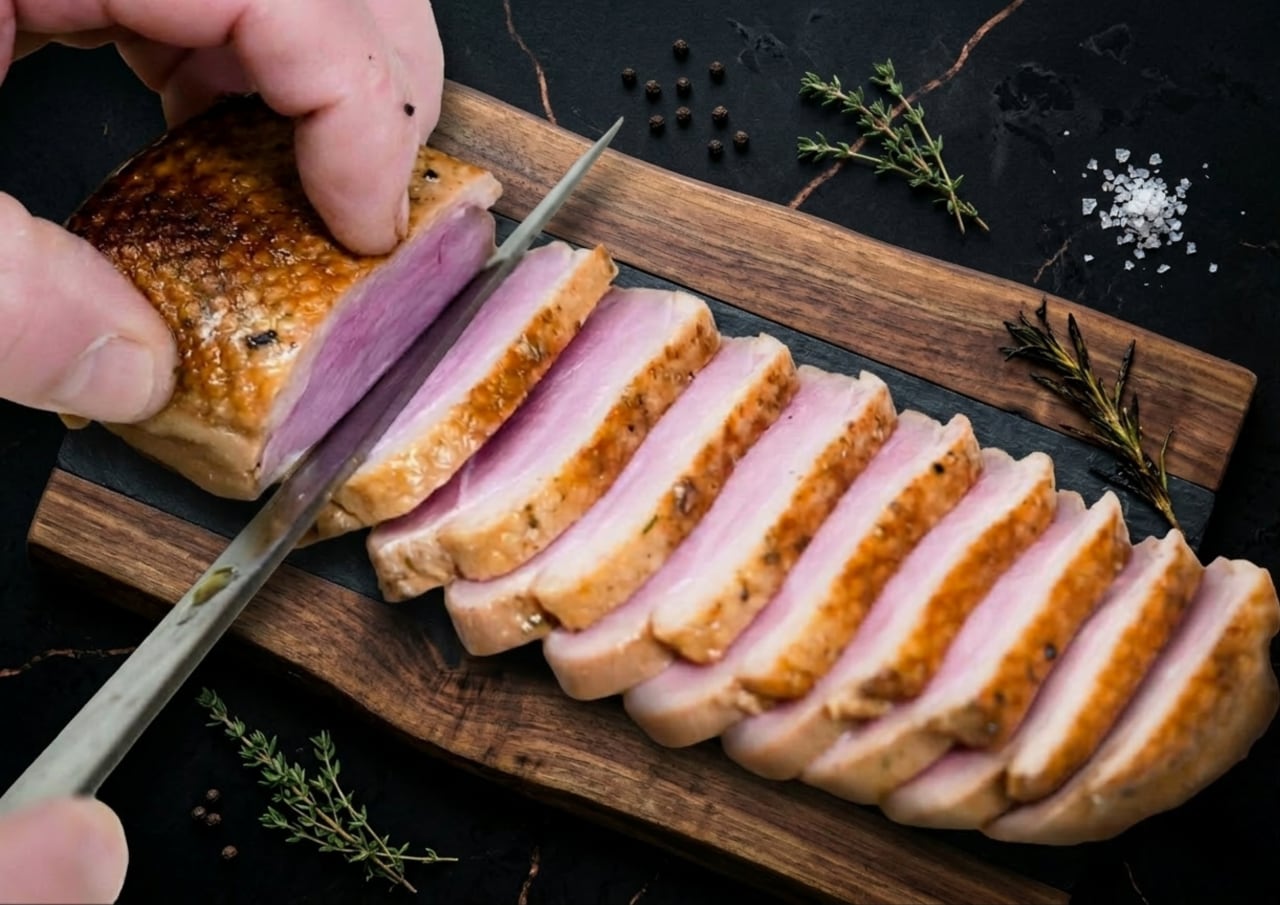 皮目をしっかりと焼き目がつくまで炙り、薄くスライスする。